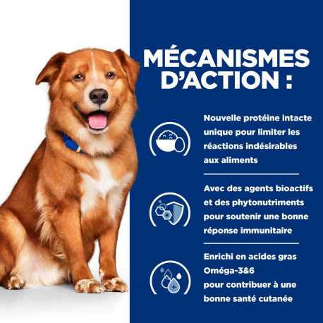 Hill's Prescription Diet Derm Complete Aliment pour Chien est la seule nutrition cliniquement prouvée pour les sensibilités alimentaires et environnementales. Cet aliment pour chien à peau sensible est la seule solution nutritionnelle diététique pour les allergies alimentaires et environnementales chez les chiens, soutenue par trois études cliniques. Il s’agit d’un aliment pour chien à ingrédients en nombre limité qui aide à gérer les allergies, la peau sèche, les démangeaisons et le grattage chez les chiens. Cet aliment humide pour chien est élaboré avec du riz et de l'œuf et a un goût délicieux que votre chien va adorer.