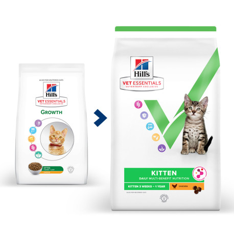 Hill's VET ESSENTIALS MULTI-BENEFIT Kitten Croquettes pour Chaton au Poulet est une nutrition complète aux bénéfices multiples, disponible exclusivement chez votre vétérinaire, et cliniquement prouvée pour soutenir la croissance et les besoins de développement de votre chaton. Pour une digestion saine et le bien-être en général, notre mélange prébiotique ActivBiome+ nourrit son microbiome en développement. Il est formulé avec des acides gras Oméga-3 pour favoriser le développement cérébral et des antioxydants pour soutenir le système immunitaire en développement — pour un meilleur quotidien, aujourd'hui et demain.