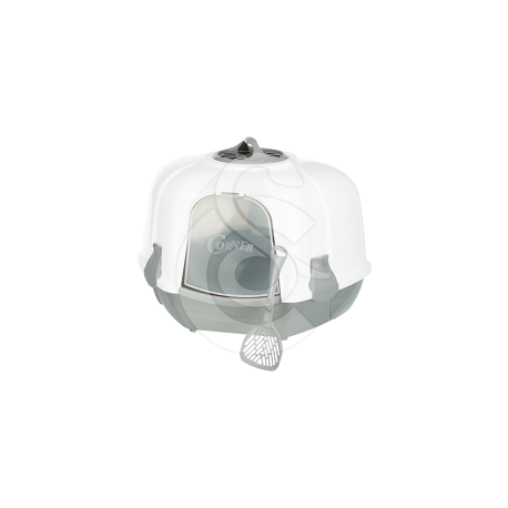 Cette maison de toilette d'angle permet de gagner de la place en occupant le coin inutilisé d'une pièce. Elle offre un espace fermé où le chat se sent en sécurité pour faire ses besoins. Elle permet également d'éviter les projections de litière, ce qui facilite le nettoyage du sol.