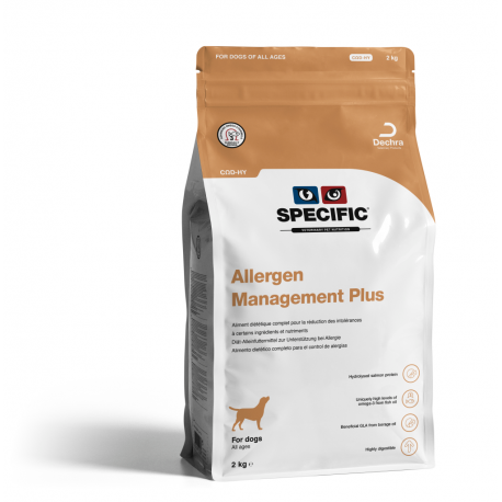 Les croquettes SPECIFIC™ COD-HY Allergen Management Plus sont adaptées aux chiens souffrant d’allergies multiples (alimentaires et environnementales (pollen, acariens, puces, ...). Elles ont été spécialement formulées par des vétérinaires. Ses ingrédients sélectionnés avec soin réduisent le risque d’allergies alimentaires. Les croquettes SPECIFIC™ COD-HY contiennent des nutriments qui participent au renforcement de la barrière cutanée, protégeant ainsi des allergènes environnementaux. Les symptômes des allergies sont soulagés par la teneur exceptionnellement élevée en Oméga-3 issus du poisson qui participent à réduire l'inflammation dont souffre l’animal.