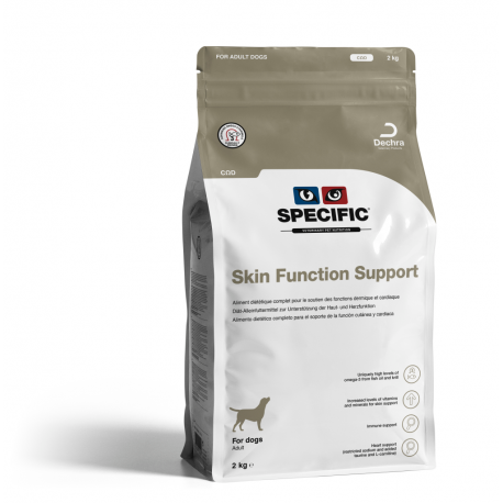 SPECIFIC™ Skin Function Support est un aliment diététique complet pour chiens adultes et seniors permettant de soutenir la fonction dermique en cas de dermatoses et de dépilation. Il contient une teneur élevée en acides gras essentiels (dont les Oméga-3 issus du poisson) et en β-1,3/1,6-glucanes. La formulation de cet aliment participe au maintien d’un bon système immunitaire et d’un poids optimal.