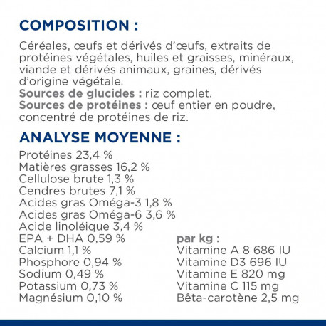 COMPOSITION : Céréales, œufs et produits d'œufs, extraits de protéines végétales, huiles et graisses, minéraux, viandes et sous-produits animaux, graines, sous-produits d'origine végétale. Source de glucides : Brisures de riz. Sources de protéines : Œufs entiers séchés, concentré de protéines de riz.