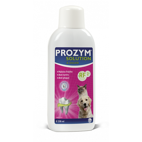 Pratique à utiliser, la solution buvable PROZYM, également formulée à base de RF2® et sans xylitol, se dilue dans l’eau de boisson et convient aux chiots, aux chiens et aux chats