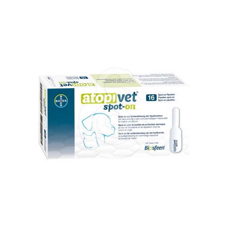 Atopivet Spot On est formulé par le laboratoire Atopivet (marque du groupe Bioiberica) avec des ingrédients de pointe : le complexe breveté Biosfeen® (sphingolipides riches en céramides) qui contribue à rétablir la structure de la barrière cutanée et l’acide hyaluronique Dermial® qui améliore l’hydratation de la peau. Le format « 16 pipettes de 2 ml » assure un soin complet sur plusieurs semaines, adapté tant aux chiens qu’aux chats.