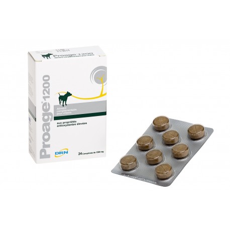 Proage 1200 est un complément alimentaire vétérinaire conçu pour aider à combattre ou prévenir les dommages oxydatifs causés par les radicaux libres chez les chiens adultes. Formulé avec des ingrédients naturels, il soutient la santé cellulaire, en particulier chez les chiens âgés ou ceux exposés à des facteurs de stress oxydatif tels que l'activité physique intense ou des régimes alimentaires riches en protéines et en lipides.