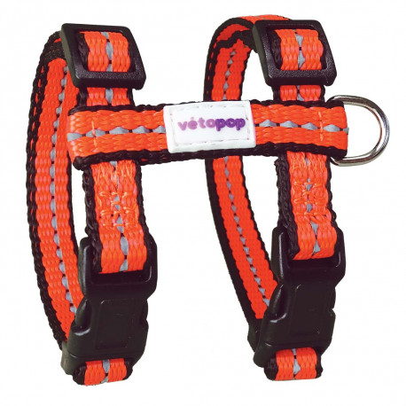 Harnais réglable pour chat, base noir avec une bande colorée et un liseré fluorescent au centre, en H, pour une pose rapide et un grand confort pour votre animal.