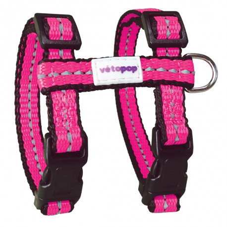 Harnais réglable pour chat, base noir avec une bande colorée et un liseré fluorescent au centre, en H, pour une pose rapide et un grand confort pour votre animal.
