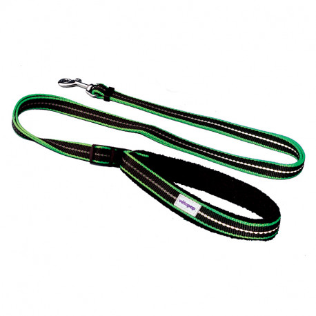 Laisse réglable pour chien, base noire avec une bande colorée et un liseré fluorescent.
