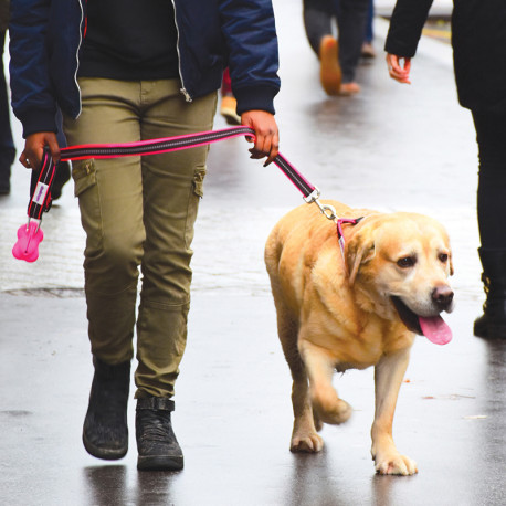 Laisse réglable pour chien, base noire avec une bande colorée et un liseré fluorescent.
