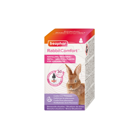 RabbitComfort diffuse un analogue (une copie) de la phéromone apaisante de lapin. Elle est naturellement sécrétée par les lapines lorsqu'elles allaitent. Cette phéromone est porteuse d'un message apaisant qui aide les lapins à avoir une perception rassurante et sécurisante de leur environnement. Le diffuseur convient à toutes les races de lapins et à tous les âges. Utiliser une nouvelle recharge après 30 jours d'utilisation.