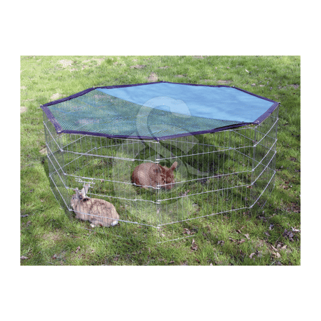 Facile grâce à cet enclos constitué de 8 éléments, avec un portillon et une toile protégeant du soleil.