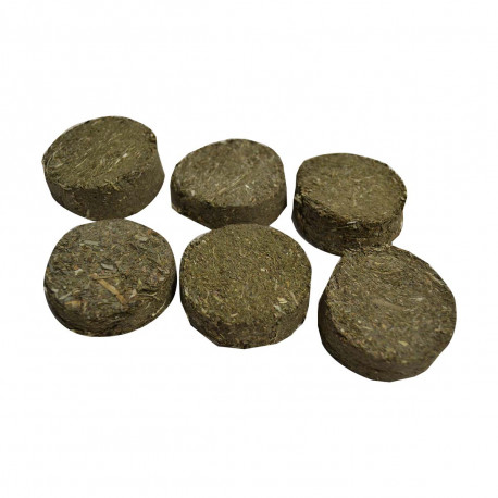 Produit fabriqué à base de brisures de foin de Crau compressées. Composé de fleurs, feuilles et graines.