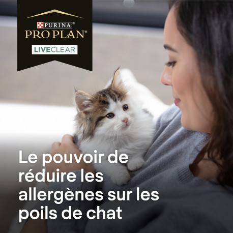 Après dix ans de recherche, PURINA® a fait une découverte révolutionnaire en matière de nutrition. Les allergènes de chat peuvent limiter les interactions entre les chats et ceux qui les aiment. PURINA® a identifié une protéine spécifique issue de l’œuf pouvant réduire sans risque la présence de Fel d1, l’allergène majeur sur les poils de chat. Les allergènes sont réduits en moyenne de 47% après trois semaines d’alimentation quotidienne*. En nourrissant votre chat chaque jour avec PRO PLAN® LIVECLEAR®, vous lui offrez une excellente nutrition, ainsi que l’extraordinaire bénéfice de réduire les allergènes sur ses poils. * Satyaraj E. et al, Immunity Inflammation and Disease. 2019; 7(2):68-73: 10 semaines d'étude sur 105 chats ayant démontré une réduction de 47% (basé sur le pourcentage moyen de réduction individuel) entre les semaines 3 et 10.