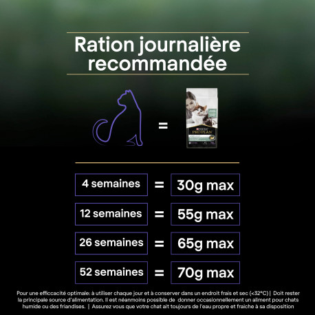 Mode d'emploi : Pour les chatons de 6 à 12 semaines, donnez 21/2 à 3 sachets tout au long de la journée; de 12 à 26 semaines, donnez 3 à 4 sachets par jour et de 26 à 52 semaines, 4 sachets par jour répartis de préférence en au moins 2 repas. Chaque chaton est différent, les rations journalières recommandées et la durée des repas doivent donc être ajustées selon son niveau d’activité et sa condition physique. Pour les chattes en gestation ou en lactation : servir à volonté avec au minimum 31/2 sachets pour la gestation et 51/2 sachets pour la lactation. Servir à température ambiante. De l’eau propre et fraîche doit toujours être disponible.