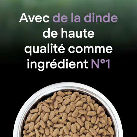 Dinde (14 %), Protéines de volaille déshydratées, farine de protéines de maïs, riz, farine de soja, gluten de blé, blé, graisse de porc, amidon de maïs, oeufs déshydratés, farine basse de blé, chicorée (2 %), substances minérales, huile de soja, cellulose, huile de poisson, hydrolysat, poudre de jaune d'oeuf, levures.