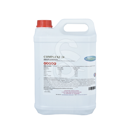 Complexe 24 – Bidon de 5 L est une solution buvable enrichie en vitamines, oligo-éléments et acides aminés, spécialement formulée pour soutenir la santé et le bien-être des animaux de ferme tels que les bovins, ovins, équins, lapins et volailles. Ce complément alimentaire est particulièrement indiqué en période de convalescence, d'inappétence, de retard de croissance ou lors de périodes de haute production.